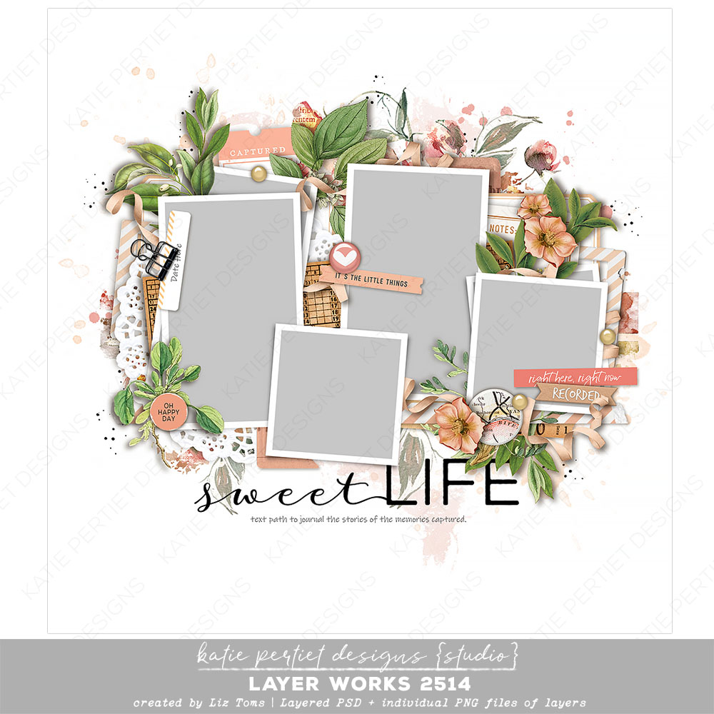 A delightful layout by Liz Toms with elements from Katie Pertiet. Packed with everything you need, it’s more of a pre-designed page than a template. Simply add your papers, photos and journaling and you’re done! Layered Adobe PSD file and individual PNGs of each layer. File Size: 80MB