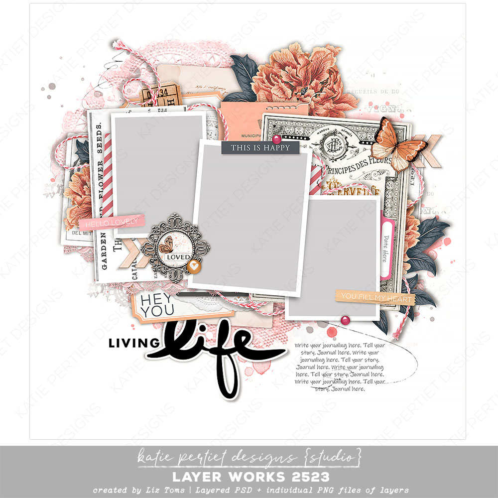 A delightful layout by Liz Toms with elements from Katie Pertiet. Packed with everything you need, it’s more of a pre-designed page than a template. Simply add your papers, photos and journaling and you’re done! Layered Adobe PSD file and individual PNGs of each layer. File Size: 140MB
