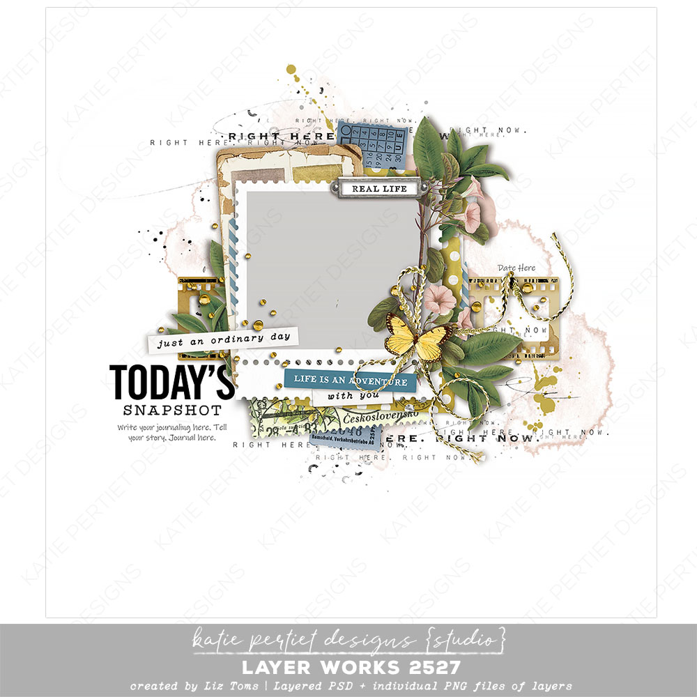 A delightful layout by Liz Toms with elements from Katie Pertiet. Packed with everything you need, it’s more of a pre-designed page than a template. Simply add your papers, photos and journaling and you’re done! Layered Adobe PSD file and individual PNGs of each layer. File Size: 55MB