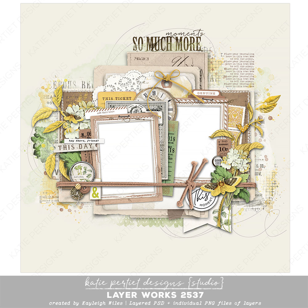 A delightful layout by Kayleigh Wiles with elements from Katie Pertiet. Packed with everything you need, it’s more of a pre-designed page than a template. Simply add your papers, photos and journaling and you’re done! Layered Adobe PSD file and individual PNGs of each layer. File Size: 170MB
