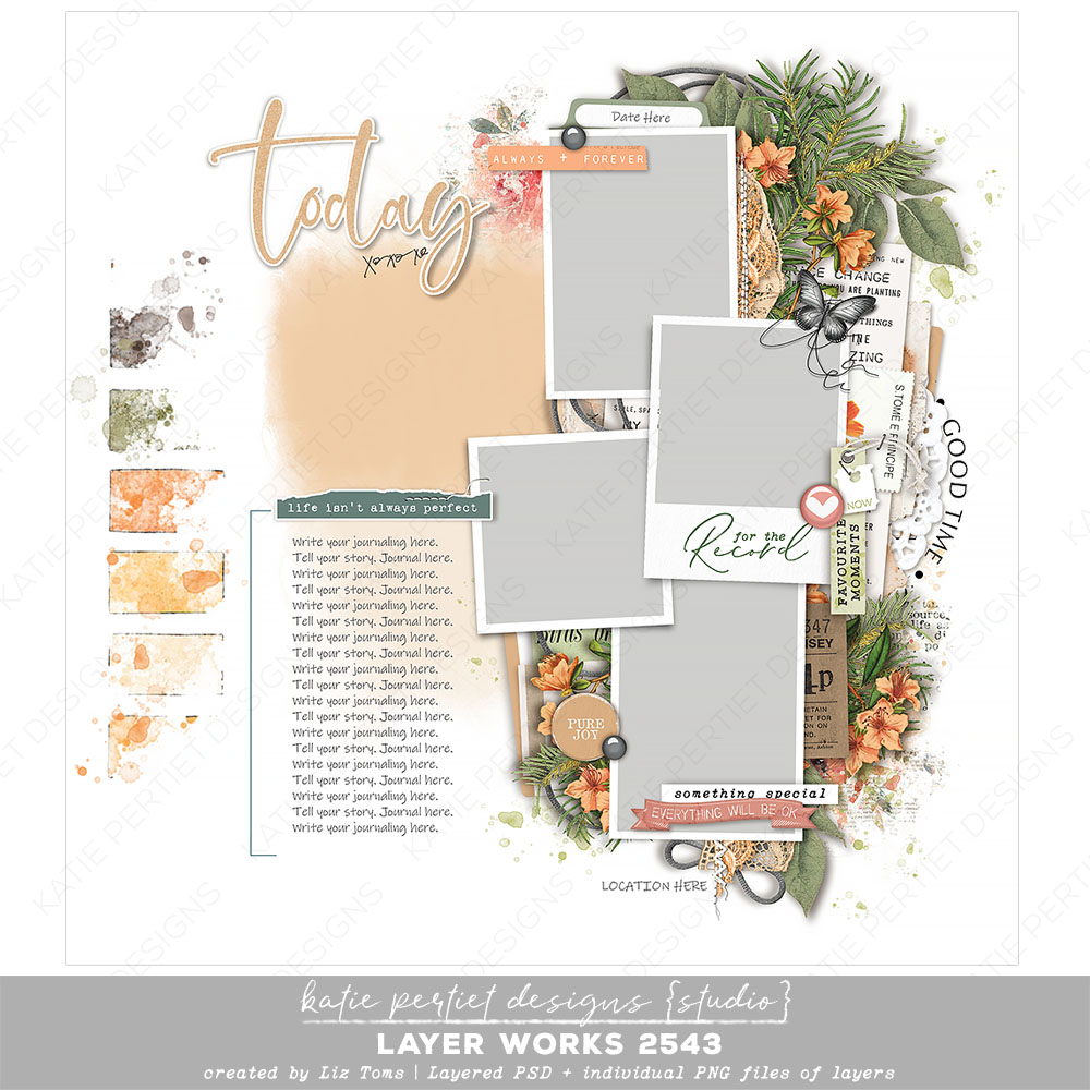 A delightful layout by Liz Toms with elements from Katie Pertiet. Packed with everything you need, it’s more of a pre-designed page than a template. Simply add your papers, photos and journaling and you’re done! Layered Adobe PSD file and individual PNGs of each layer. File Size: 110MB