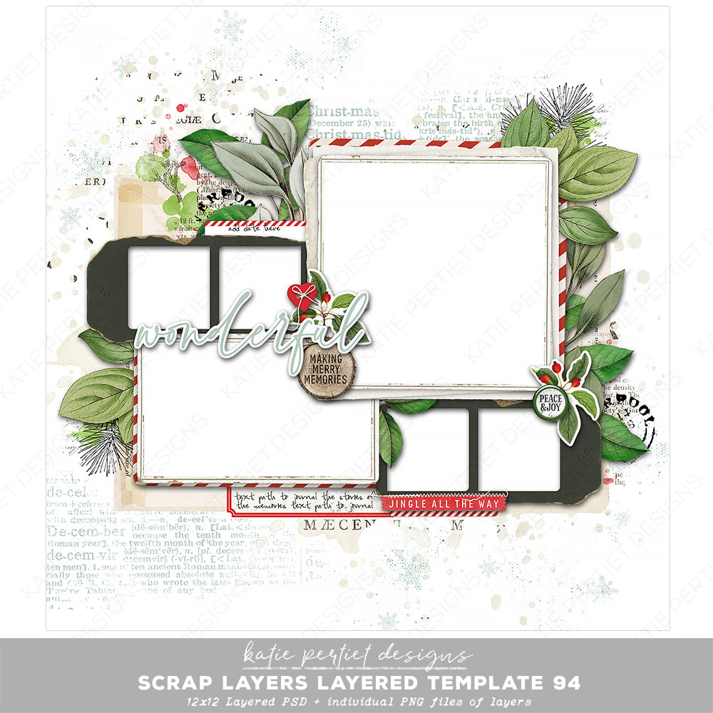 The scrap layers series of templates have nearly everything you need to create a beautiful page. Simply add your paper, photos, journaling and you’re finished! Or customize the page by changing colors, adding elements, removing elements and more. These pages get you started in a great direction. Layered Adobe PSD file and individual PNGs of each layer. File Size: 135MB