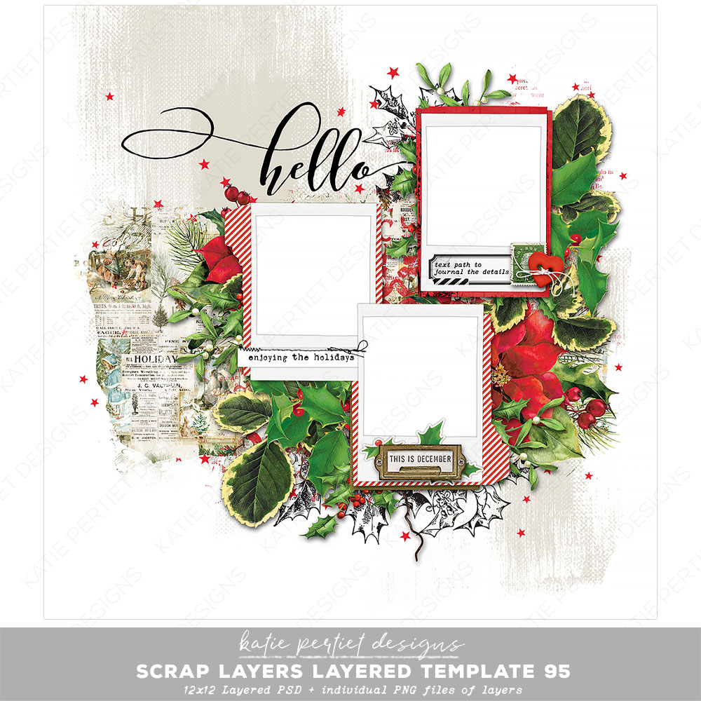 The scrap layers series of templates have nearly everything you need to create a beautiful page. Simply add your paper, photos, journaling and you’re finished! Or customize the page by changing colors, adding elements, removing elements and more. These pages get you started in a great direction. Layered Adobe PSD file and individual PNGs of each layer. File Size: 115MB