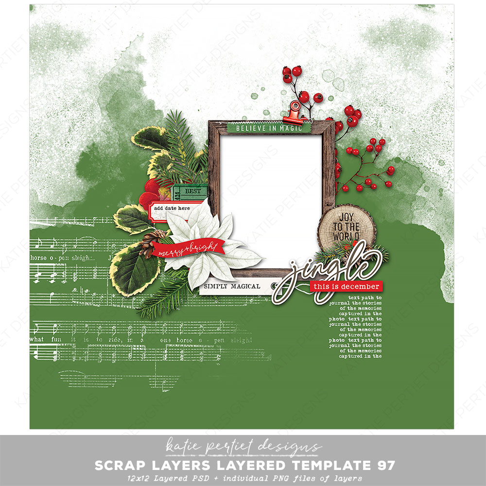 The scrap layers series of templates have nearly everything you need to create a beautiful page. Simply add your paper, photos, journaling and you’re finished! Or customize the page by changing colors, adding elements, removing elements and more. These pages get you started in a great direction. Layered Adobe PSD file and individual PNGs of each layer. File Size: 50MB