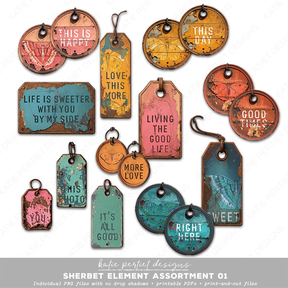 17 assorted tags and sentiment tags in a grungy sherbet palette. Includes individual PNG files with no drop shadows, printable PDFs and print-and-cut optimized files. File Size: 35MB