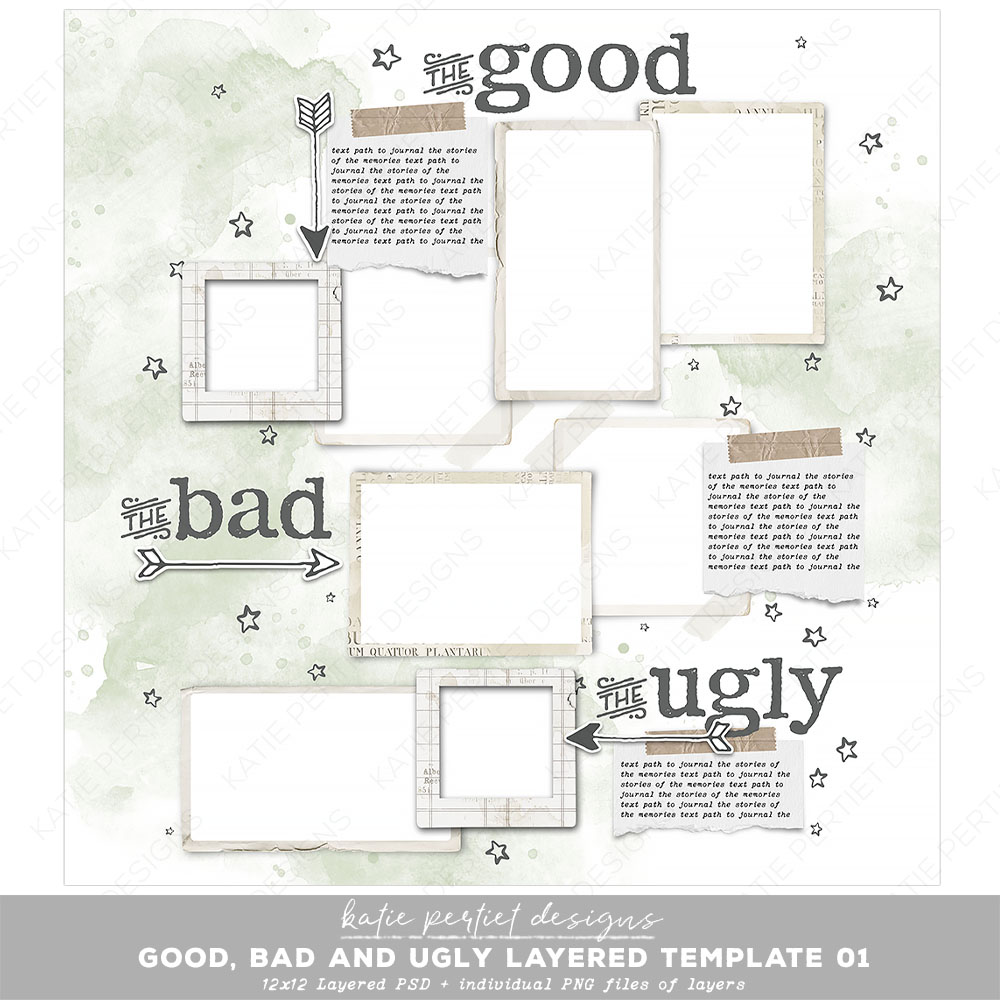 This template has nearly everything you need to create a beautiful page recapping your year with the good, bad and the ugly. Simply add your paper, photos, journaling and you’re finished! Or customize the page by changing colors, adding elements, removing elements and more. These pages get you started in a great direction. Layered Adobe PSD file and individual PNGs of each layer. File Size: 40MB