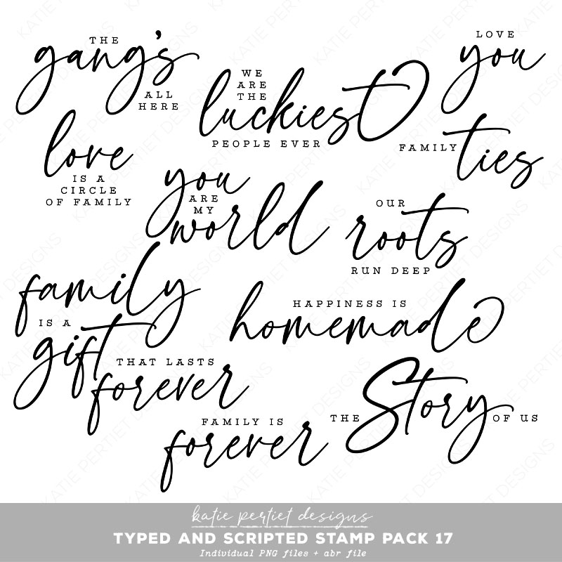 11 Typed and scripted sentiments for an instant page title. Individual PNG files and an .abr file.