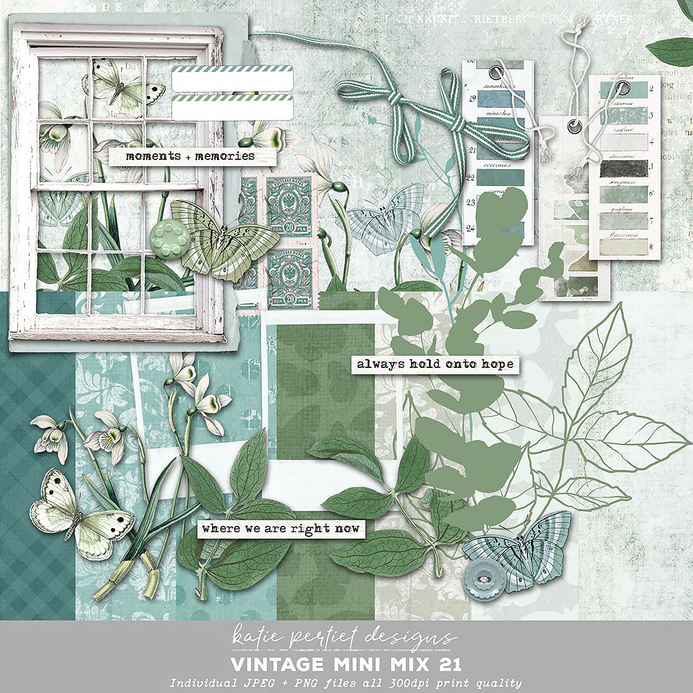 A vintage mini kit that includes 8 designer 12×12 papers and 20+ assorted coordinating embellishments. Individual JPEG and PNG files. File Size: 30MB